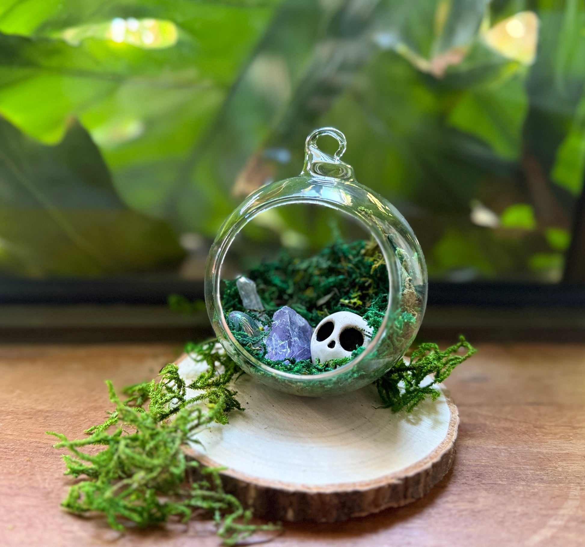 Hanging Terrarium with skull and crystals.