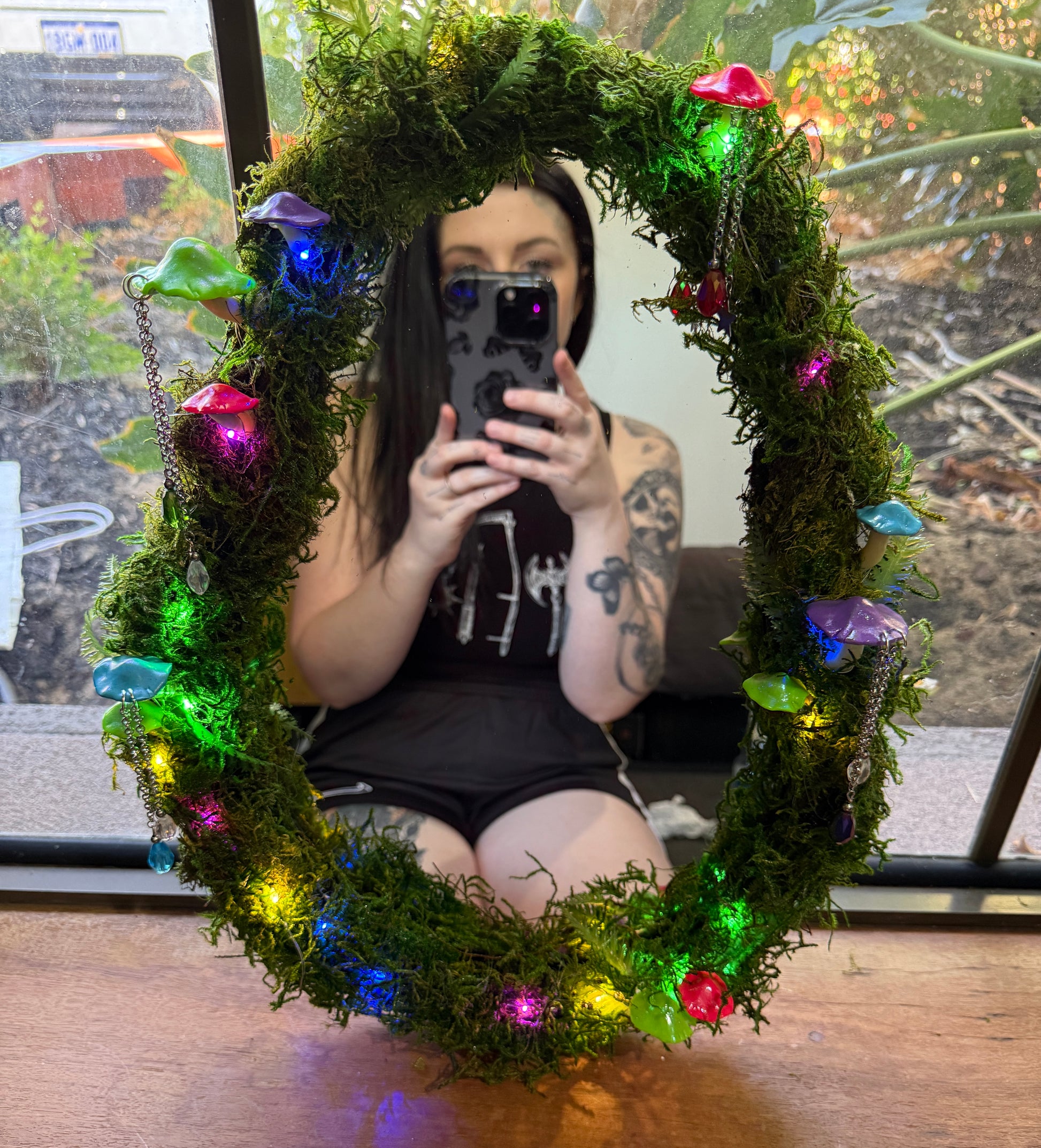 Handpainted and decorated mirror. With Polymer clay neon mushrooms (stems glow in the dark) Preserved moss and glass beads.